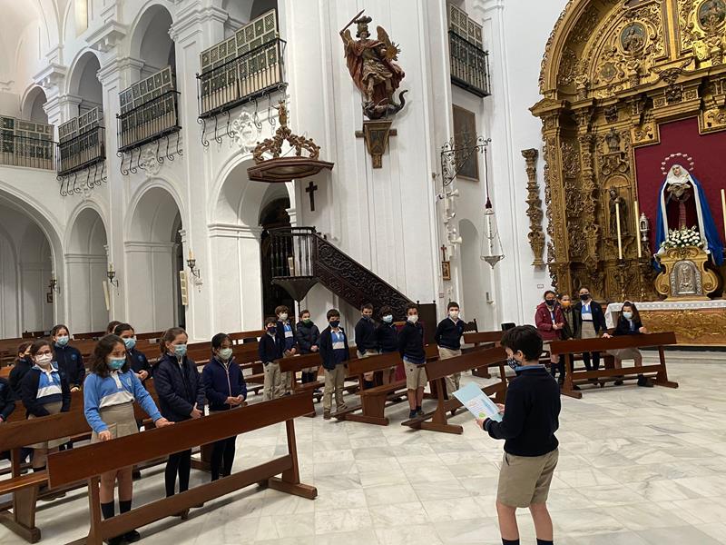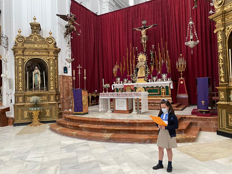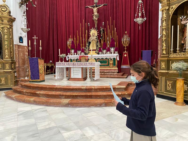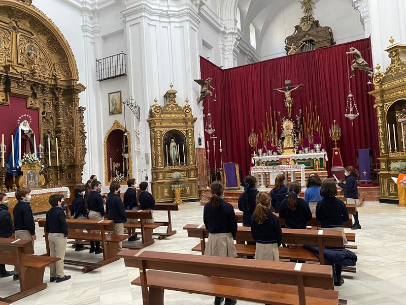 En la tercera semana de Cuaresma, los alumnos/as de 4º E.P, rezan sus oraciones al Señor ante el altar de nuestra Iglesia de Santa Cruz.